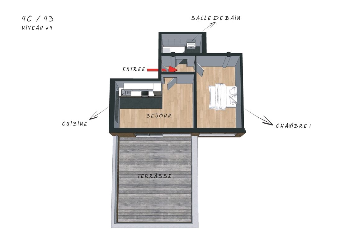Cet appartement d’une chambre dispose d’une salle de bains complète. Le séjour lumineux s’ouvre sur une terrasse généreuse avec vue panoramique, idéale pour profiter des beaux jours et se détendre. L’espace bénéficie de larges baies vitrées coulissantes qui inondent les lieux de lumière naturelle et créent une atmosphère chaleureuse.