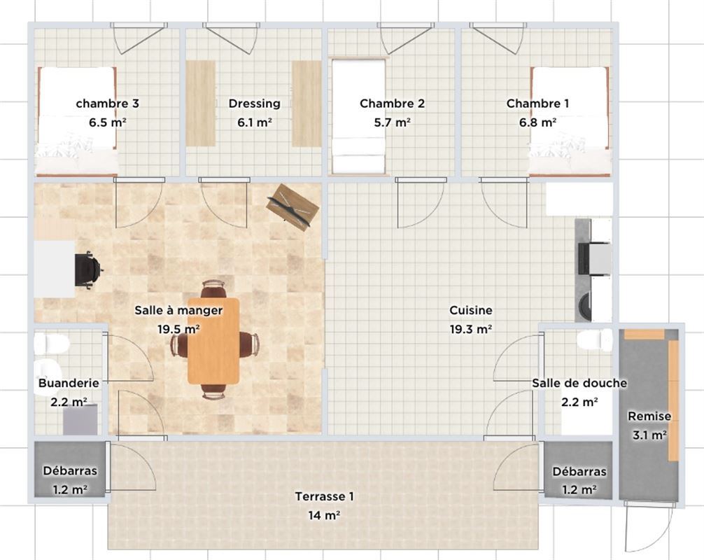 Salon13,03 m²Cuisine2,53 m²Chambre à coucher 15,00 m²Chambre à coucher 25,00 m²Salle de douche2,05 m²Bureau2,53 m²Dressing4,03 m²Salle à manger13,43 m²Débarras2,00 m²