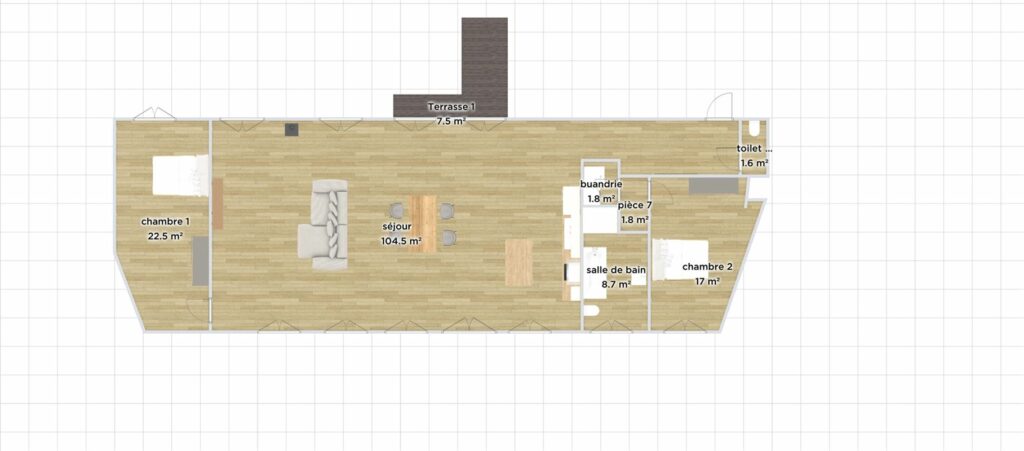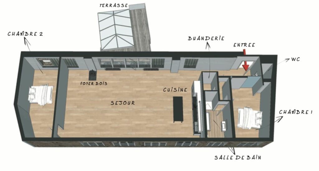 À l’entrée, une vaste pièce à vivre baignée de lumière naturelle grâce aux grandes fenêtres vous accueille. Les poutres apparentes et le parquet en chêne naturel clair ajoutent une touche d’élégance et de chaleur à cet espace ouvert. La cuisine américaine, entièrement aménagée et équipée, est parfaite pour les amateurs de cuisine et de convivialité.