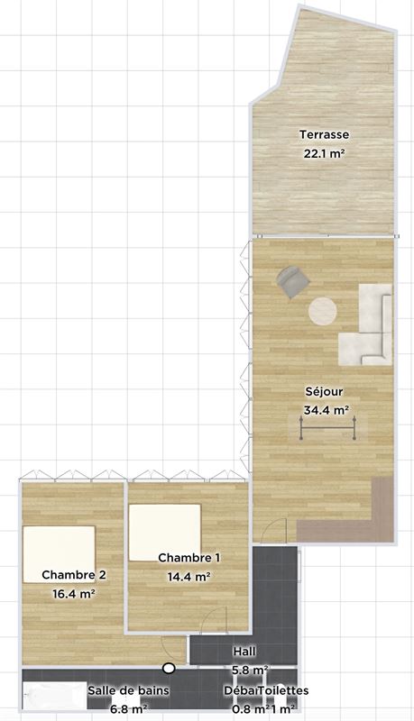 Hall d'entrée5,18 m²Cuisine super-équipée37,41 m²Hall de nuit1,98 m²Toilette 11,41 m²Buanderie1,19 m²Salle de bains 17,60 m²Chambre à coucher 117,60 m²Chambre à coucher 11,84 m²Chambre à coucher 215,51 m²