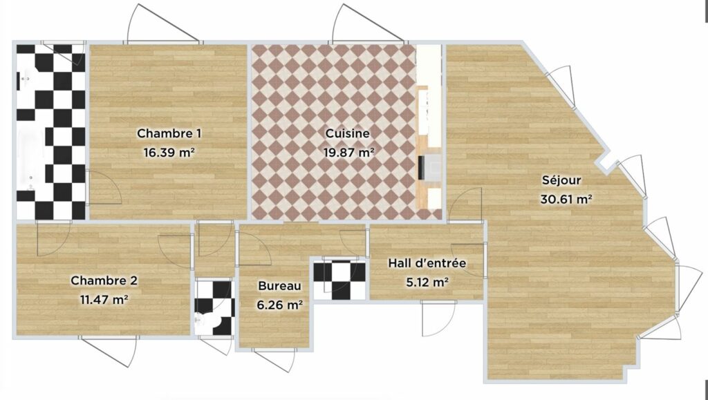 Hall d'entrée5,10 m²Salon13,23 m²Salle à manger25,40 m²Cuisine super-équipée12,06 m²Chambre à coucher 116,27 m²Chambre à coucher 212,54 m²Toilette 11,24 m²Bureau4,77 m²Salle de bains 111,33 m²Buanderie1,44 m²Hall de nuit1,32 m²