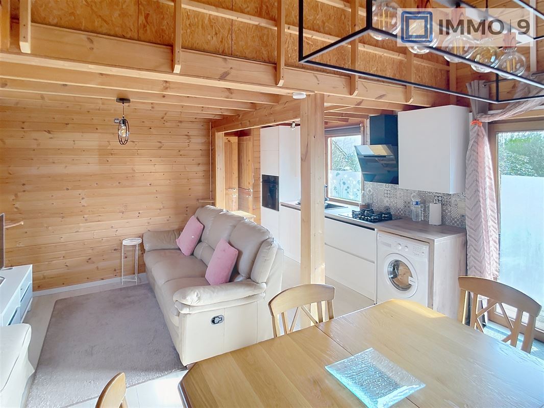 L’espace de vie principal allie cuisine équipée et séjour, créant un environnement convivial . Le revêtement en bois confère un charme authentique à l’ensemble, tandis que les baies vitrées inondent les pièces de lumière naturelle.