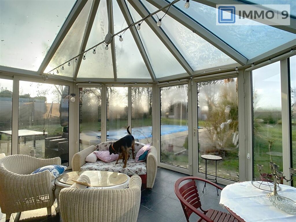 La propriété dispose également d’une spectaculaire véranda en longueur, véritable atout pour profiter du jardin verdoyant. Cet espace de détente offre des vues pittoresques sur les environs et la piscine chauffée avec couverture bleue, parfaite pour les beaux jours.