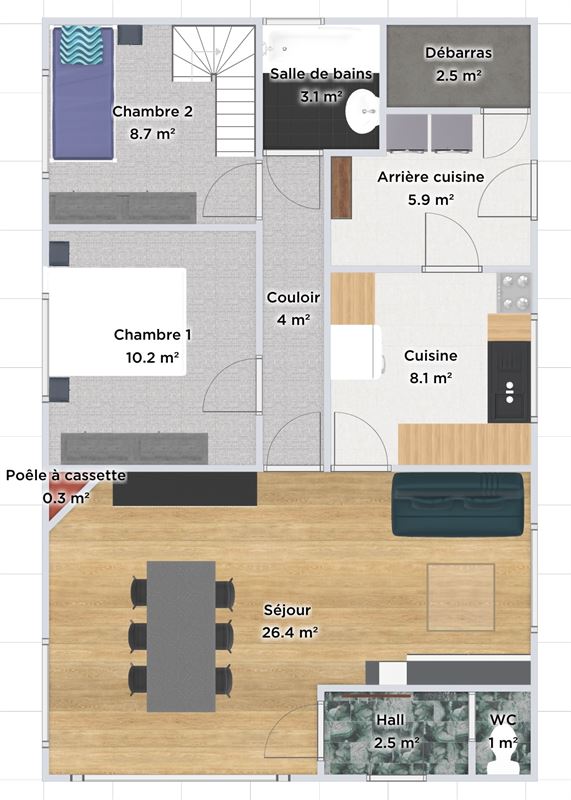 À votre disposition, un rez-de-chaussée spacieux comprenant deux chambres élégantes, un séjour lumineux, une cuisine équipée, une buanderie, une salle de bains, un espace WC, ainsi qu’un hall d’entrée et un couloir. Le sous-sol abrite un garage pour une voiture et un atelier, une troisième chambre dans les greniers sous la toiture et possibilité d’en aménager une quatrième.