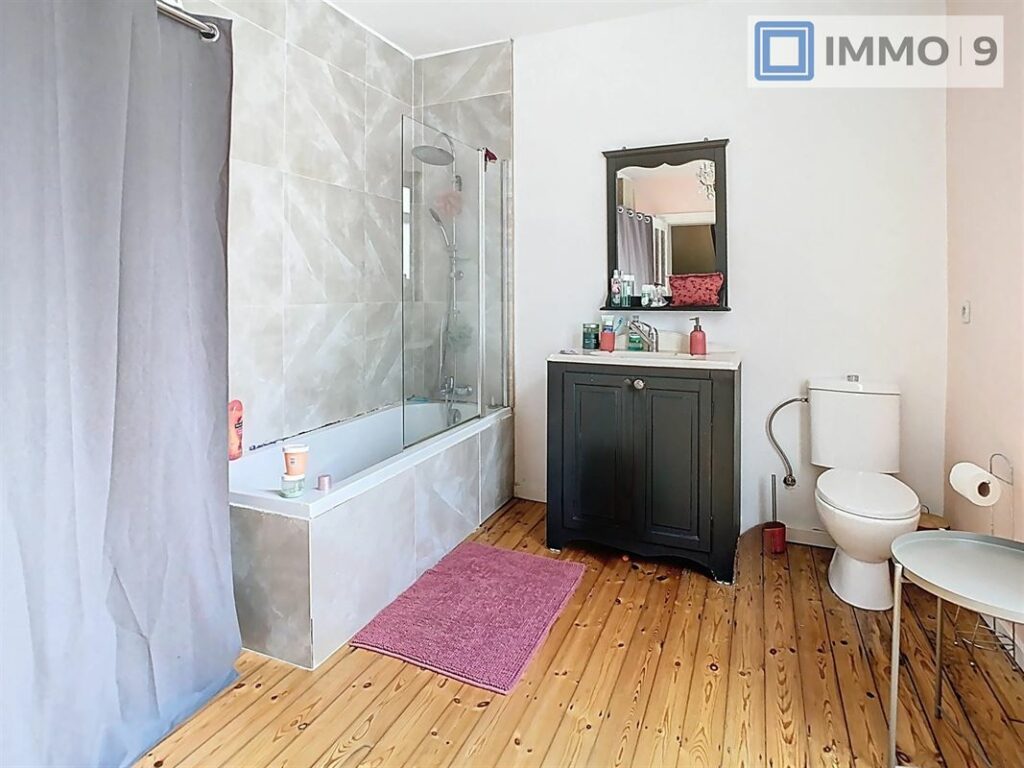 L’escalier en bois authentique mène à l’étage, où vous trouverez deux chambres généreuses, offrant chacune un espace de confort et de tranquillité. La salle de bains, élégante et bien agencée, comprend une baignoire pour votre bien-être quotidien.