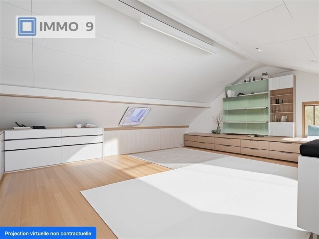 La maison bénéficie d’une belle lumière naturelle grâce à ses grandes fenêtres et offre une flexibilité d’aménagement intérieure. La maison dispose de 2 chambres avec la possibilité d’une 3ème et 4ème dans le grenier à aménager.